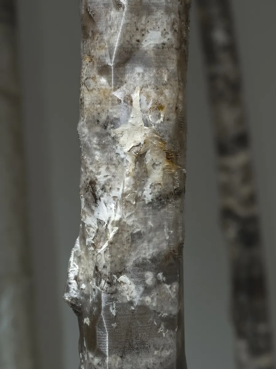 Deep Forest ne è il perfetto esempio. L’installazione – che ha richiesto due anni di lavoro – utilizza materiali reperiti localmente. Centodue tronchi di betulla recuperati nei dintorni del museo creano un ambiente immersivo che replica quello naturale della foresta, attraversato da vari percorsi. Venti biodegradatori stampati in 3D, prodotti con biopolimeri a base di alghe e riempiti con trecento chili di fondi di caffè, fungono da alberi sintetici. Questi sono colonizzati da micelio vivente, che cresce e consolida la struttura, permettendo la creazione di forme architettoniche biologicamente attive. Il micelio è la parte vegetativa dei funghi, costituita da un intreccio di filamenti chiamati ife, che genera una rete sotterranea o superficiale e svolge un ruolo fondamentale negli ecosistemi, poiché decompone la materia organica, favorisce il riciclo dei nutrienti e stabilisce connessioni simbiotiche con le radici delle piante. Quarantaquattro reattori fotosintetici in vetro contengono cianobatteri e alghe marine, reperite in loco, capaci di catturare seicento grammi di CO₂ al giorno, l’equivalente di una piccola foresta matura.