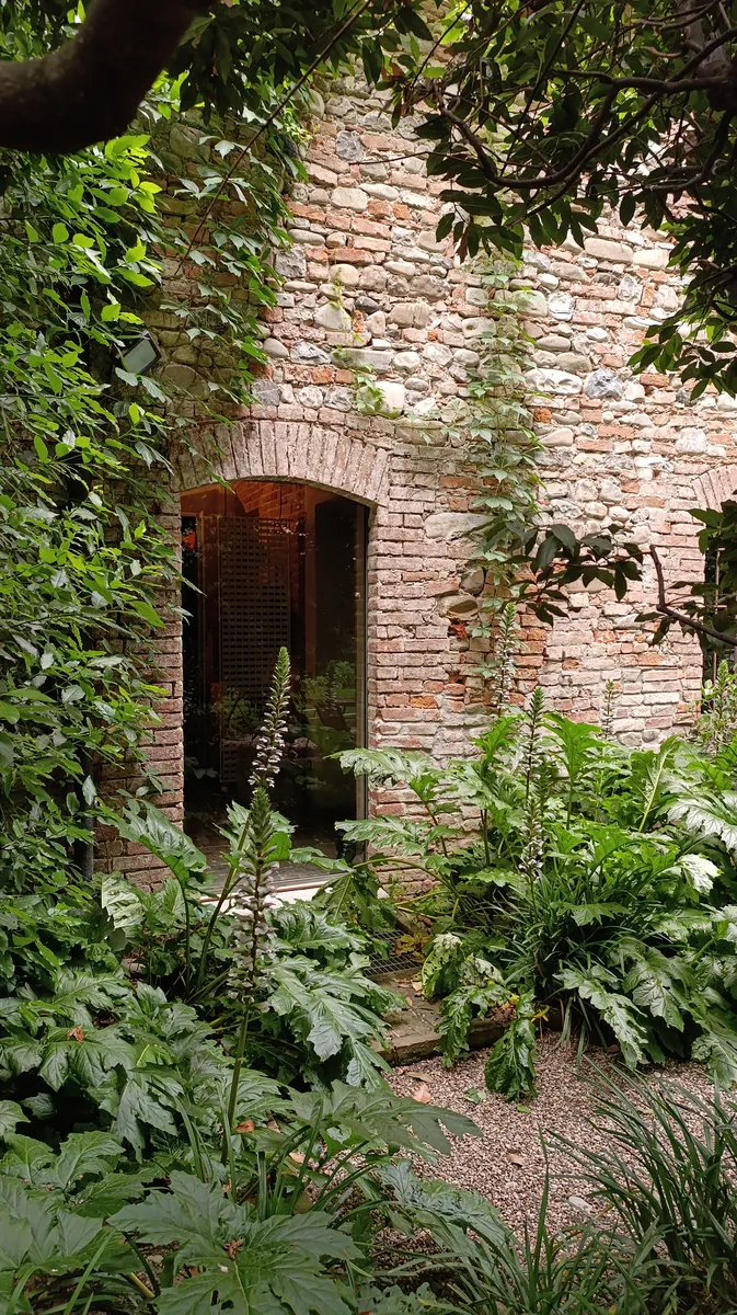 Poco importa se le nuvole velano il cielo, si è distratti da un verde magnetico che si insinua ovunque. Insiste e si arrampica persino sui muri in pietra dell’abitazione che pare dissolversi al suo interno. La sensazione è quella di trovarsi in un rifugio silenzioso interrotto solamente dal fruscio delle fronde.