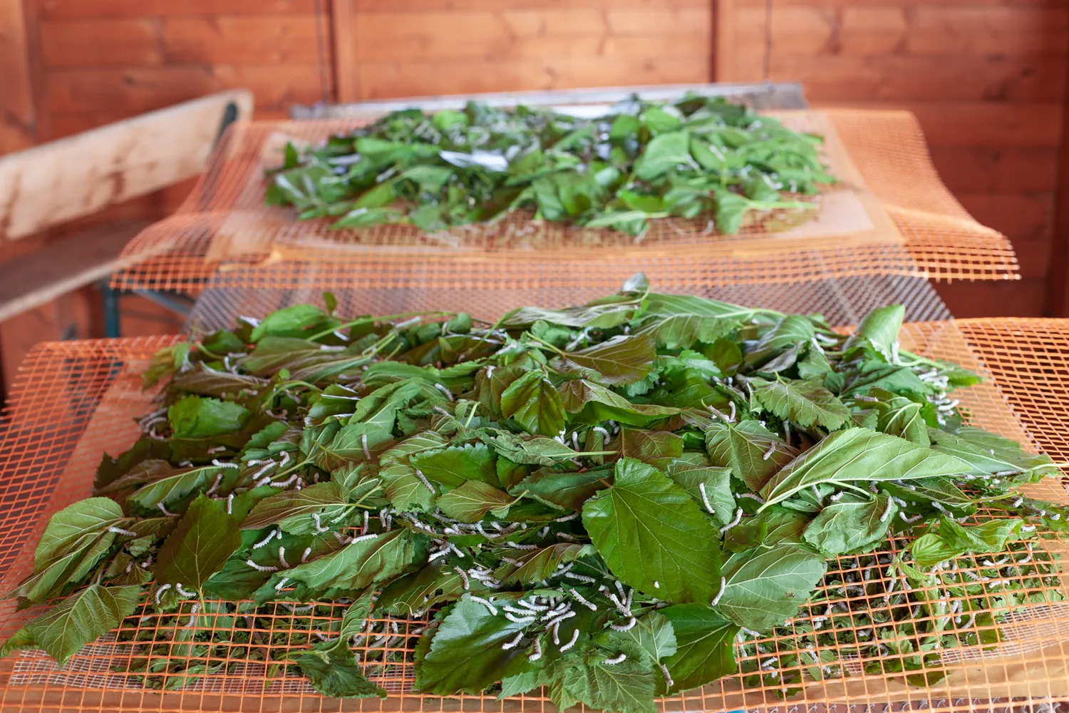 Larve di baco da seta allevate su foglie di gelso nelle lettiere del progetto Gelseta
