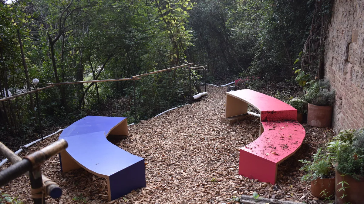 La sostenibilità non può, pertanto, essere scissa dall’accessibilità, e a tal proposito il costante dialogo con la comunità sordo-cieca è stato uno spunto prezioso. I rami tagliati durante la potatura, tinti di bianco acceso, sono diventati una guida che delimita il sentiero e permette agli ipovedenti di seguirlo più agevolmente. Le sedute sono circolari, per facilitare il dialogo in Lis ed essere più accoglienti per tutti: la forma circolare rispetto all’angolo retto è più rilassante per il nostro occhio. Erbe aromatiche creano isole sensoriali emanando il loro intenso profumo e gli angoli destinati alla lettura hanno Qr code dipinti sui tronchi: non rimandano solo a testi ma anche a materiale audiovisivo, per garantire l’inclusività di tutti.
