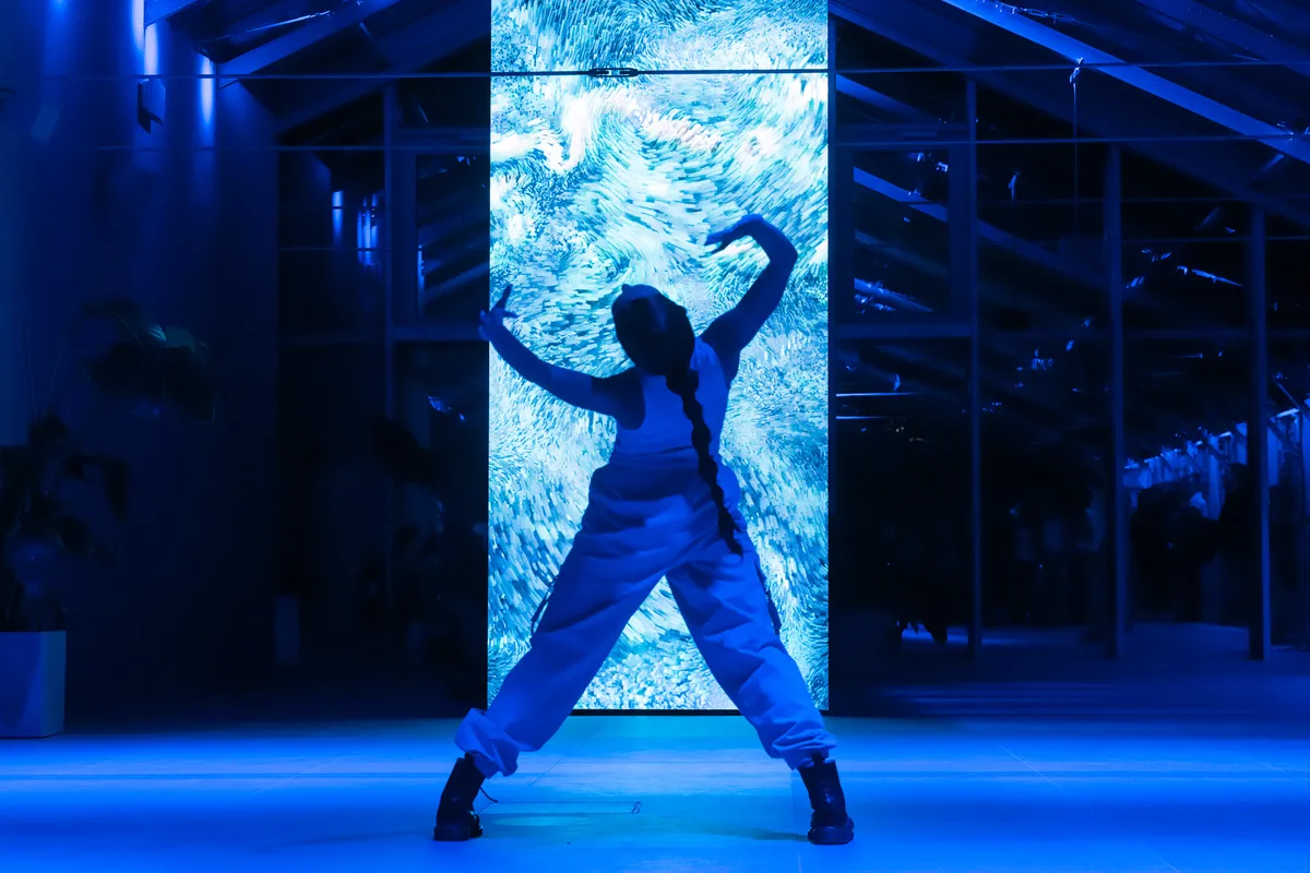 Saranno passate più o meno tra le 1000 e le 1200 persone in tre giorni, è stato molto bello. Sicuramente un pubblico composto da molti curatori, artisti e addetti ai lavori. Noi abbiamo proposto un lavoro di Eva Papamargariti, artista greca che qui ha voluto prendere spunto dal romanzo di Virginia Woolf, “Le onde”, per creare un’installazione audio e video dedicata all’acqua, al tempo come dimensione circolare, alla soggettività fluida delle persone. L’installazione comprendeva cinque schermi che andavano in sincrono, con audio immersivo: si intervallavano immagini naturali e immagini prodotte attraverso l’intelligenza artificiale, con un software di morphing che fondeva forme animali e umani, che continuamente si mescolavano una nell’altra.