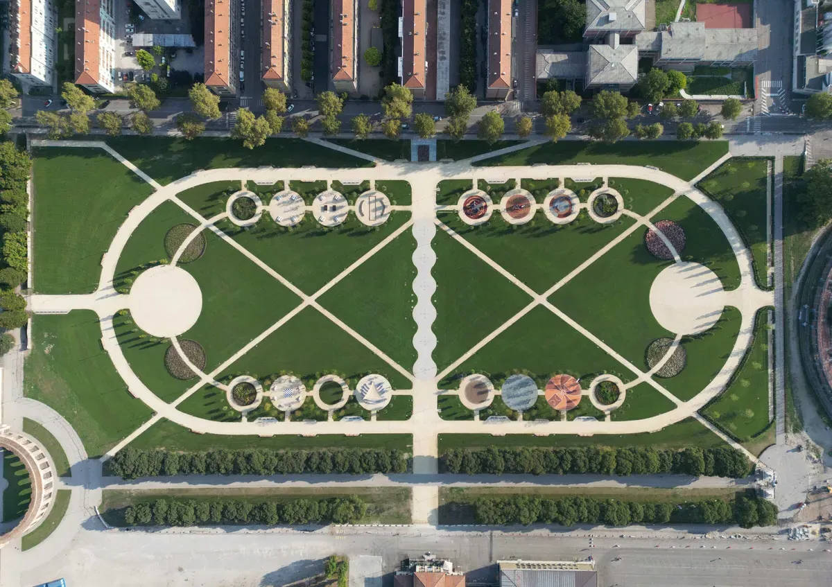 Così, si è deciso di riprendere la struttura del giardino interno di Palazzo Te, un’esedra, a sua volta poi suddivisa in tante esedre più piccole, in cui piante colonnari ne rievocano il colonnato seicentesco. Per valorizzare la neoclassica Porta delle Aquile, che costituisce l’ingresso principale al parco, si è realizzata una piazza ellittica, quasi interamente pavimentata in calcestre. Da qui parte il viale del Te, il cui lato esposto alla ferrovia è stato schermato dalla piantumazione di una siepe di carpini di tre metri d’altezza.