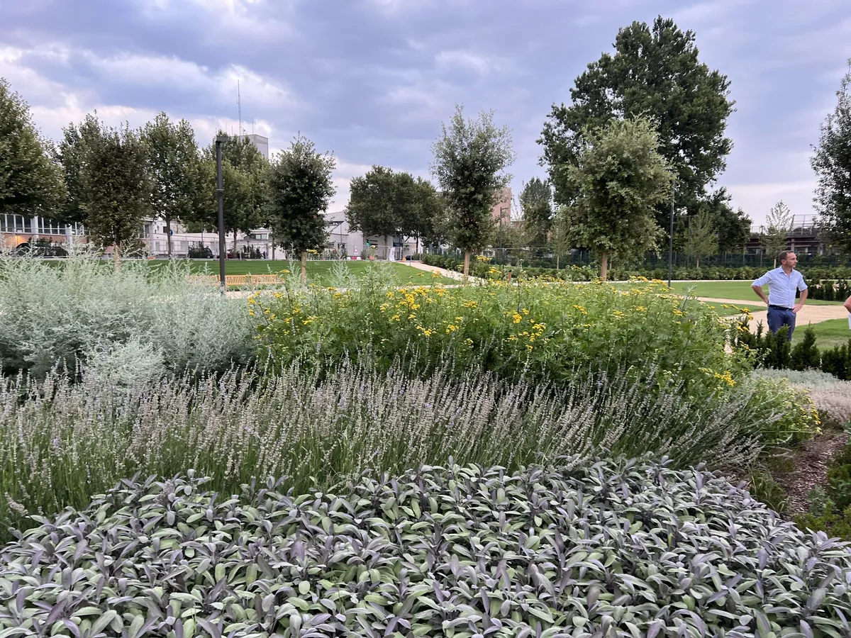 Il nuovo Parco Te è stato progettato con un occhio di riguardo per la sostenibilità, sfruttando la biodiversità per mitigare le isole di calore, migliorare la permeabilità del suolo e riequilibrare il rapporto tra ombra ed esposizione al sole. 48.000 sono i metri quadri di prato, cui si aggiungono 274 alberi (Carpinus betulus, Quercus ilex, Platanus x acerifolia, Quercus robur pyramidalis x bimundorum, Celtis australis), 1.400 metri di siepi, 620 metri quadri di arbusti e 955 di roseti.